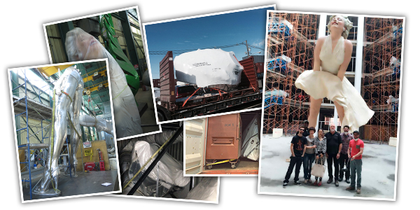 The sculpture, along with 2 large toolboxes for the assembly and installation, was shipped in four sections- 1 x 20′ flat rack and 1 x 40′ Open Top. The sculpture successfully made it to Dalian despite copious amounts of bureaucracy at Chinese customs.